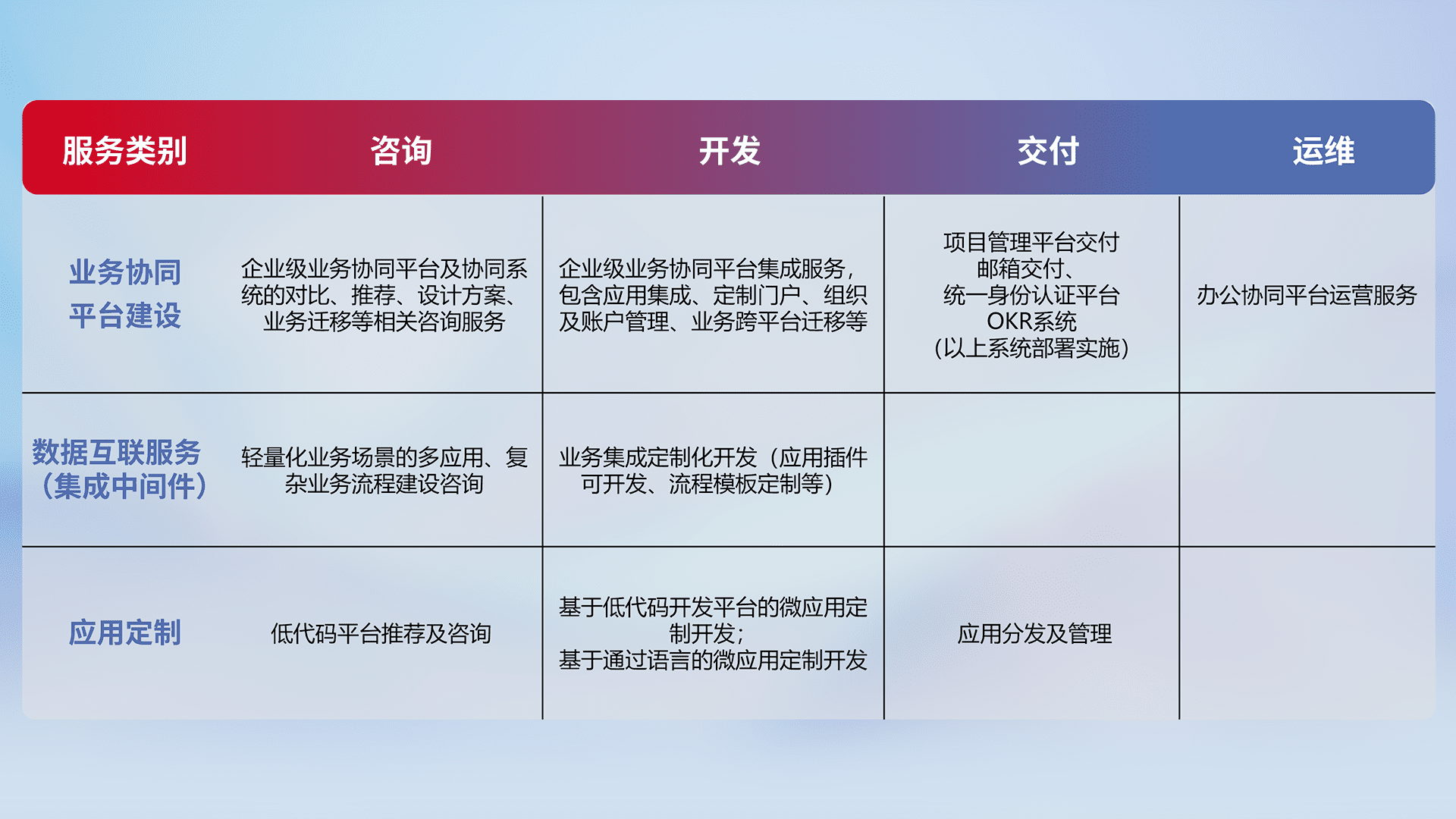 针对钉钉、、企微、、、IDaas等平台级产品提供产品的规划、、方案、、交付、、、定制化开发等服务,,,实现如统一协同办公、、、智能客户服务、、混合会议管理、、、智能数据查询、、等业务场景,,实现数字化转型。。。